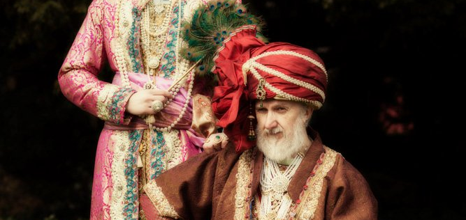 One very particular commission we were delighted with is our recreation of the Maharajah. This costume is composed of a simple blue linen undershirt. On top of which is worn a pair of blue embroidered tunban pyjamas. The chogga is made from copper and green silk and is richly decorated with beads. Over all of this is worn a full length angrakha made from cerise silk with gold motifs. This coat is embellished with beads and crystals and reflects the wealth and status of its owner.