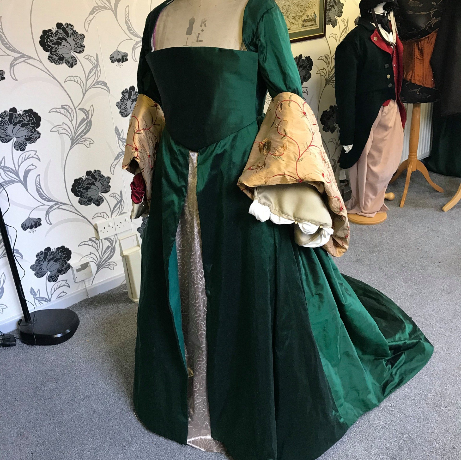 The example pictured on the right shows a complete Tudor French Gown, a commission from G Hughs & Son includes made to measure shift, stays, underpinnings, petticoats, gown and hood, as well as accessories sourced by us. A commission with us could include an entire ensemble or just an element of the outfit such as a suitable head piece.